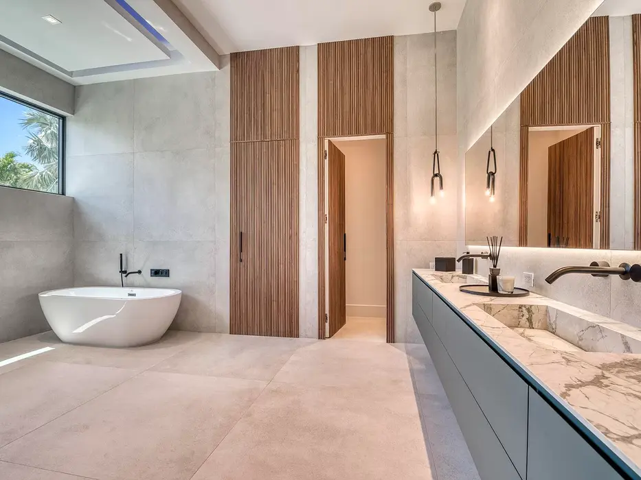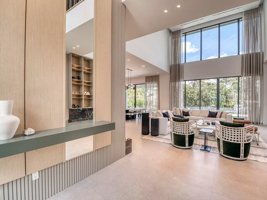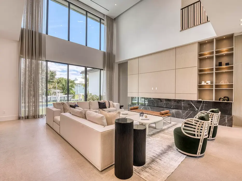 At the heart of the home, a gourmet kitchen is outfitted with Sub-Zero and Wolf appliances, Mia Cucina custom cabinetry, Bianco Supreme quartzite countertops, a bespoke island, and a 150-bottle dual-zone wine cooler—designed for both culinary excellence and entertaining in style. Additional features include a dedicated office, an upstairs balcony with tranquil views, and a private outdoor escape complete with a pool, spa, and a brand-new boat lift—perfect for waterfront living with direct access to the best of South Florida.