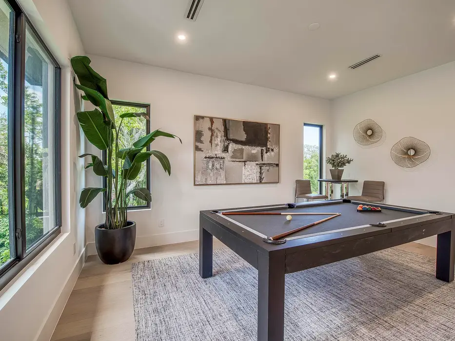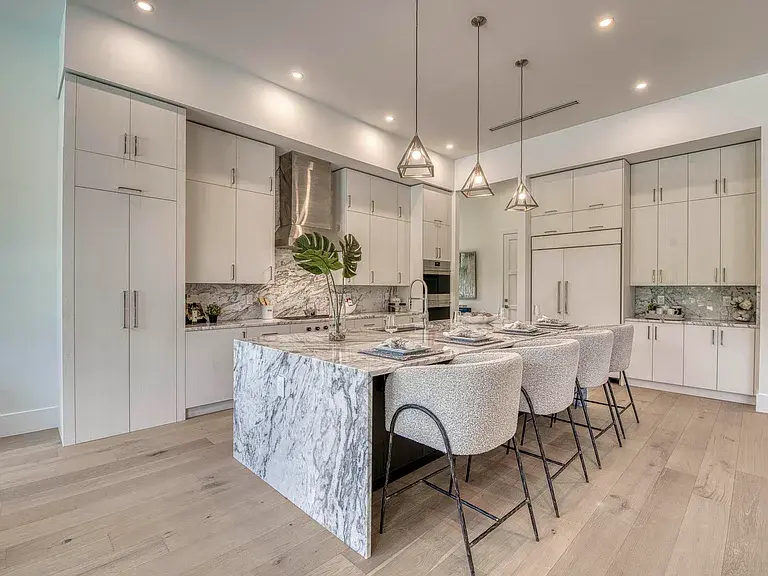 Inside, 10-foot sliders fill the space with natural light, highlighting European white oak floors and a bold, modern fireplace wall. The chef’s kitchen is anchored by a waterfall-edge marble island and equipped with Sub-Zero and Wolf appliances, floor-to-ceiling cabinetry, and matching stone countertops and backsplash, perfect for everyday living or entertaining. The main-level primary suite offers a serene retreat with dual walk-in closets, a soaking tub, and a spa-style shower. Upstairs, a loft and game room provide flexibility, while every guest room features an en-suite bath and walk-in closet. Outside, enjoy a full summer kitchen, pool with sun shelf, and spa—all framed by tropical landscaping for total privacy. Designed with care and intention, this home pairs high-end finishes with true livability in the heart of Palm Beach Gardens.